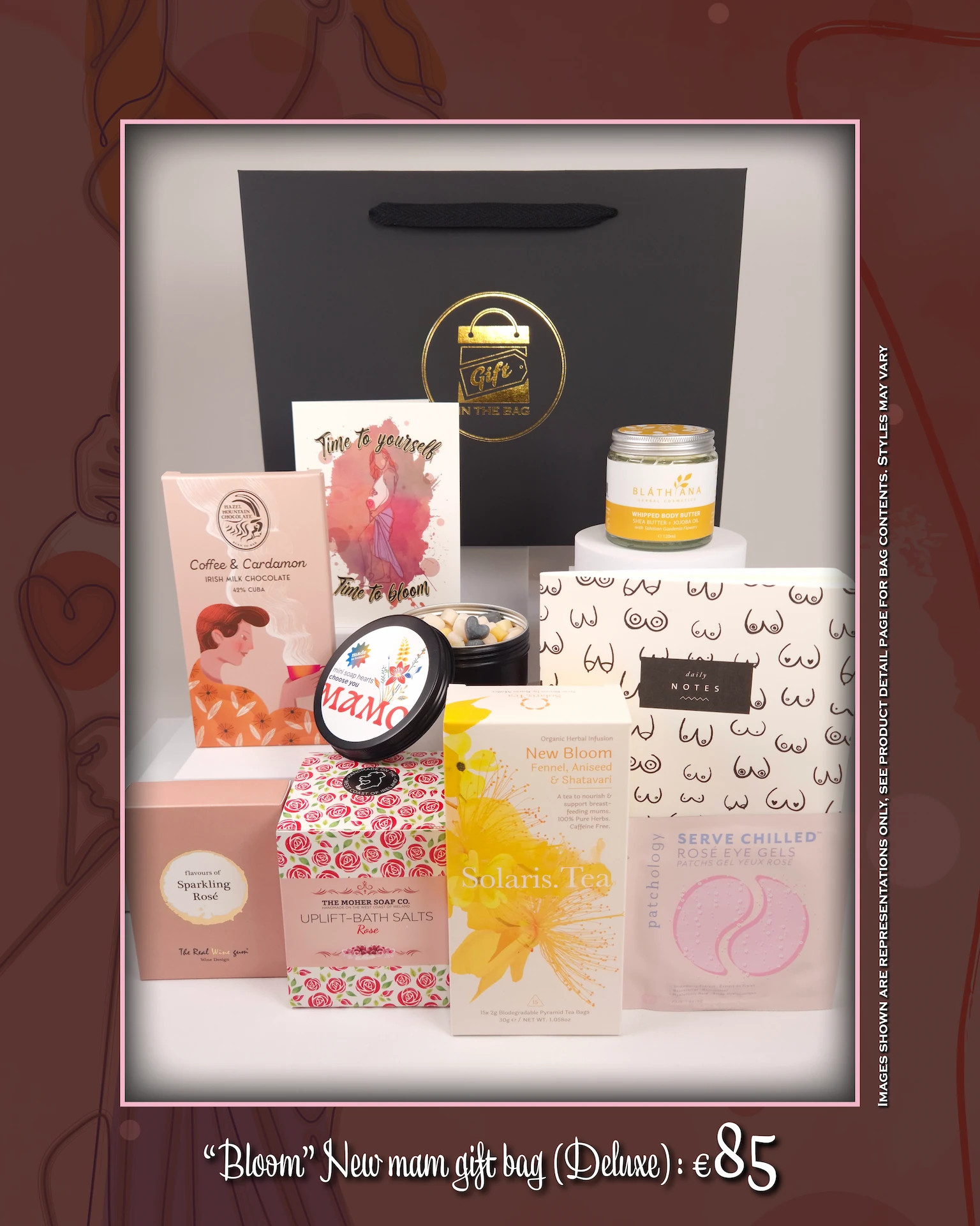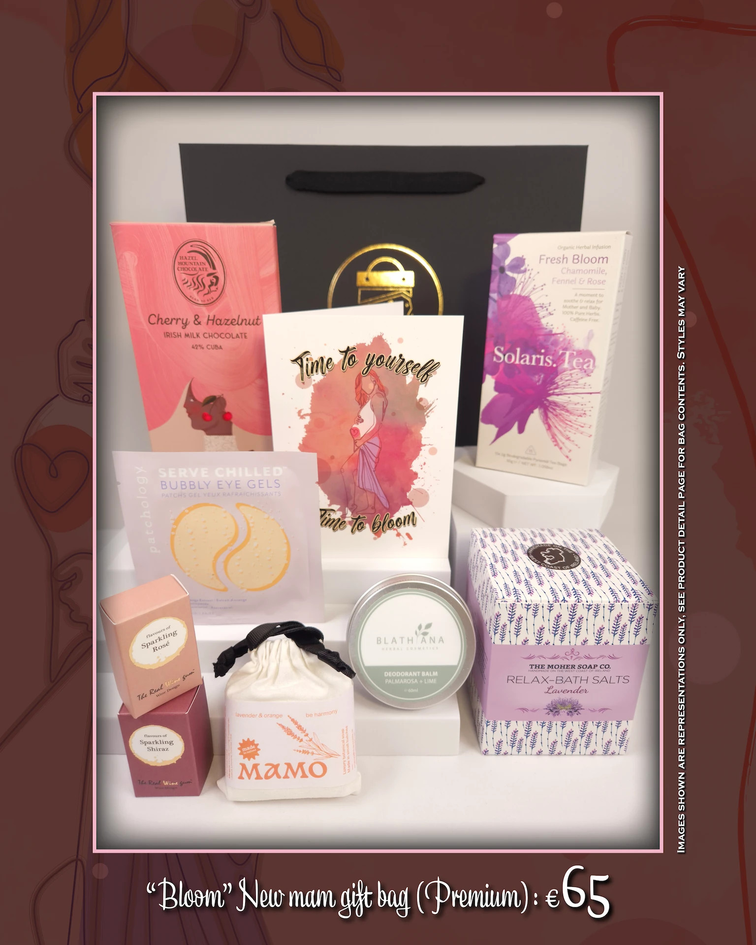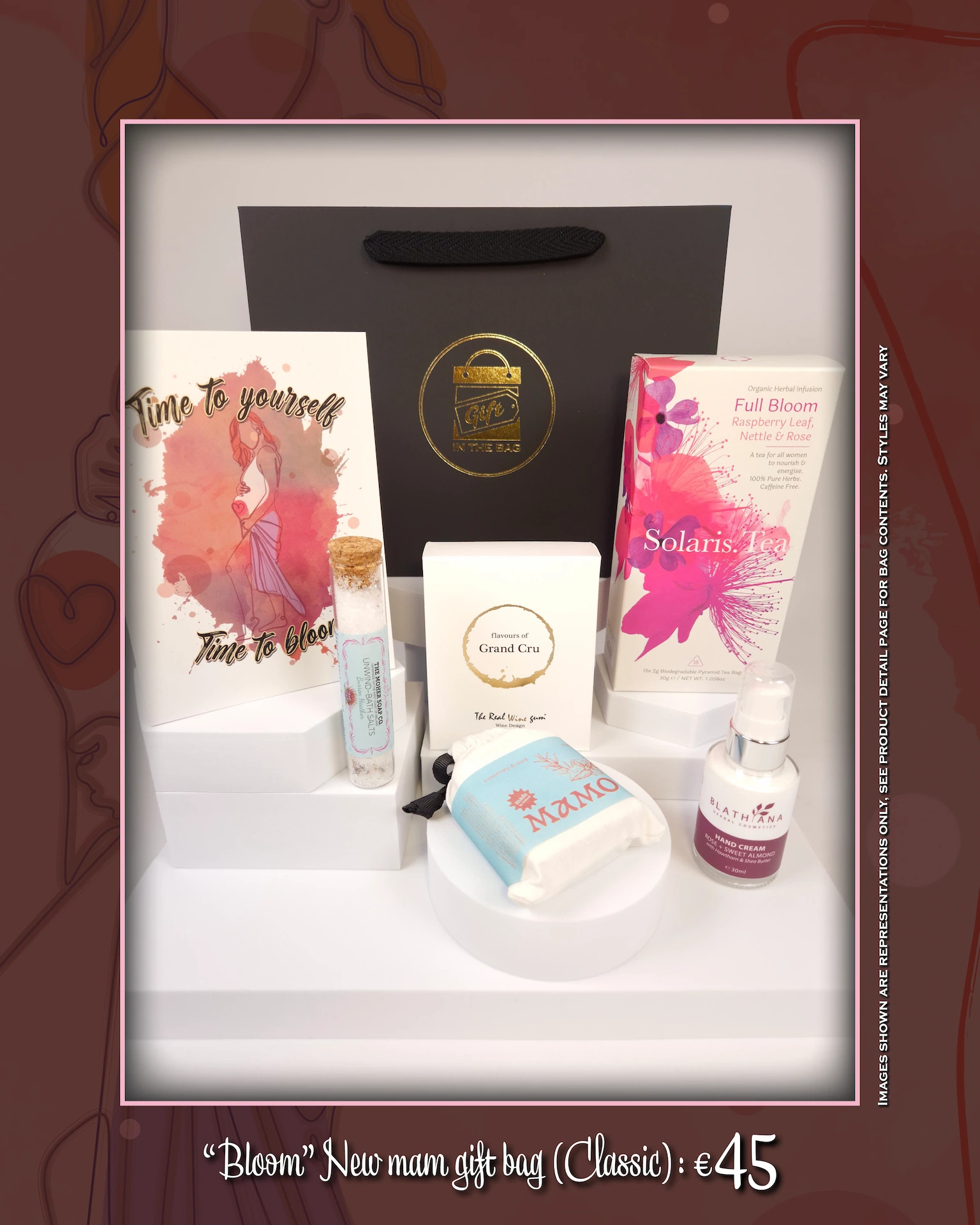 Introducing our "Bloom" New mam gift bag. Promising at least a few precious moments of peace and relaxation; this is the perfect gift to give any tired (new or expectant) mama a new lease of life.