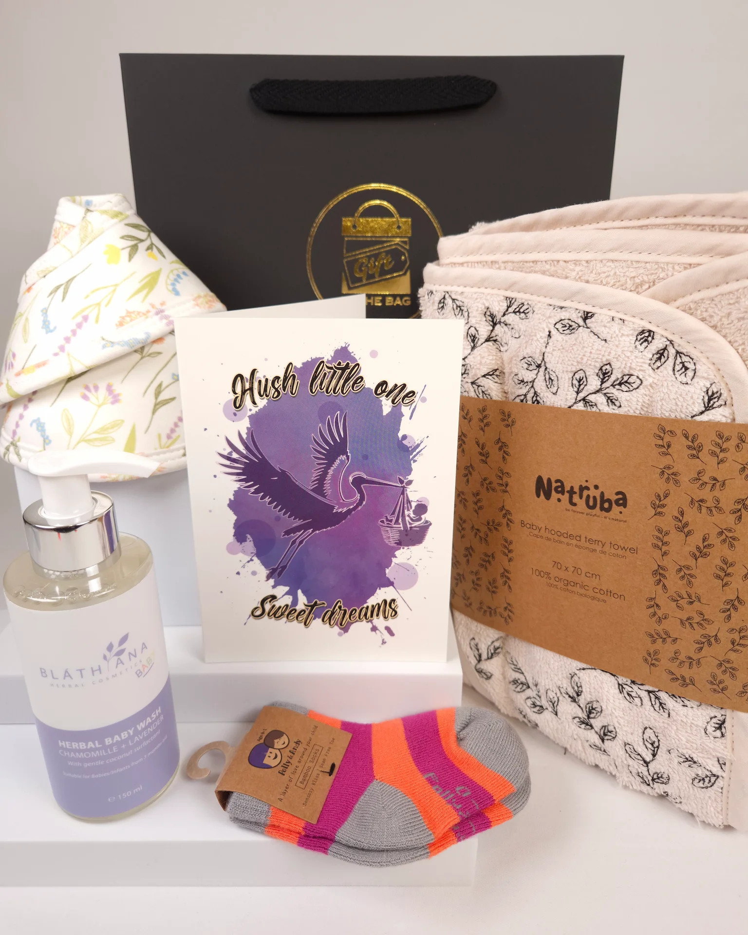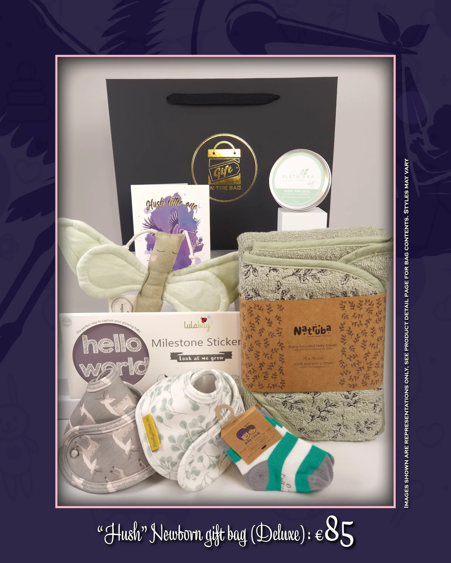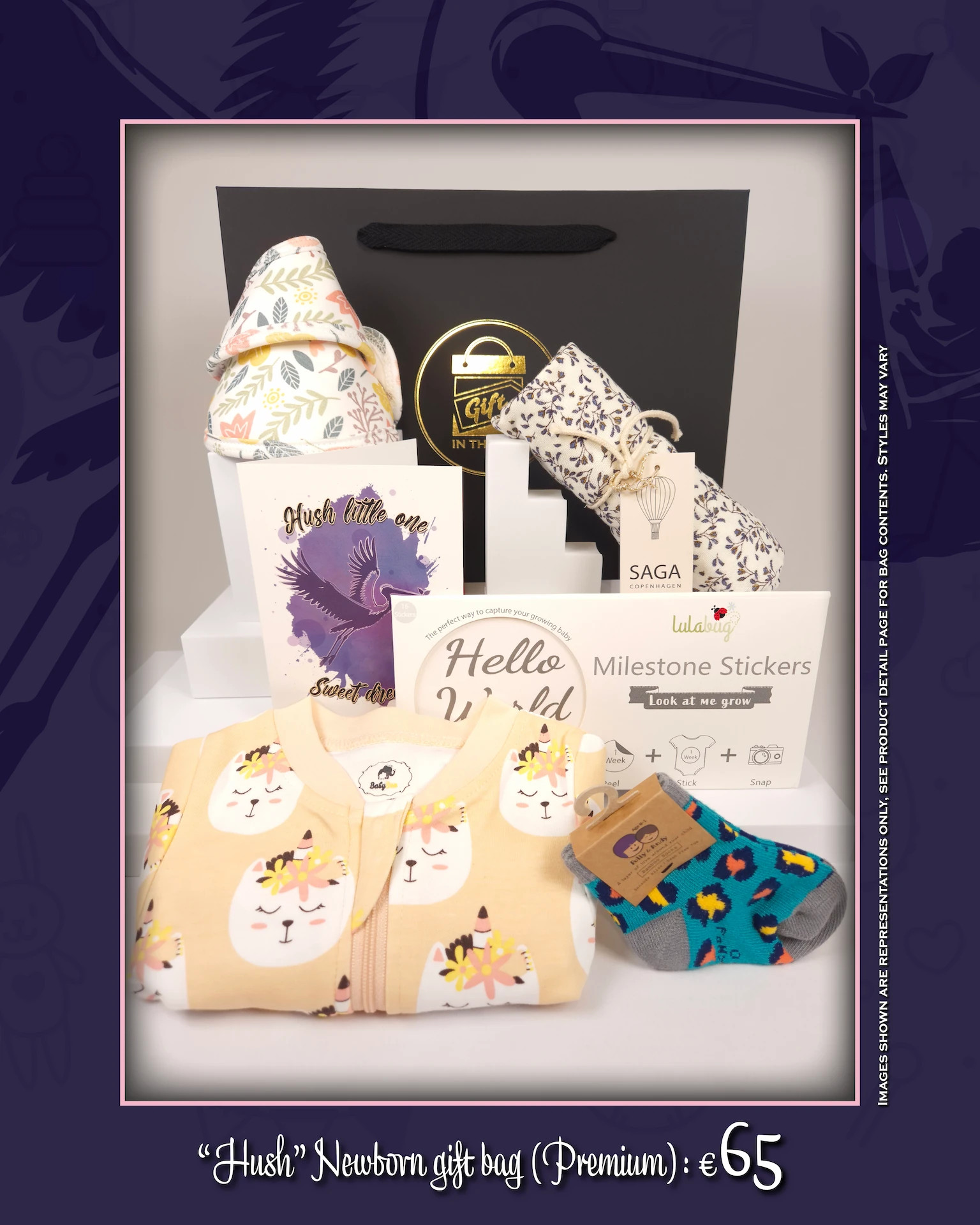 Introducing our "Hush" Newborn baby gift bag. Packed with soft textures, soothing scents and a variety of styles to match any preference; this is the perfect gift for any beautiful baby.