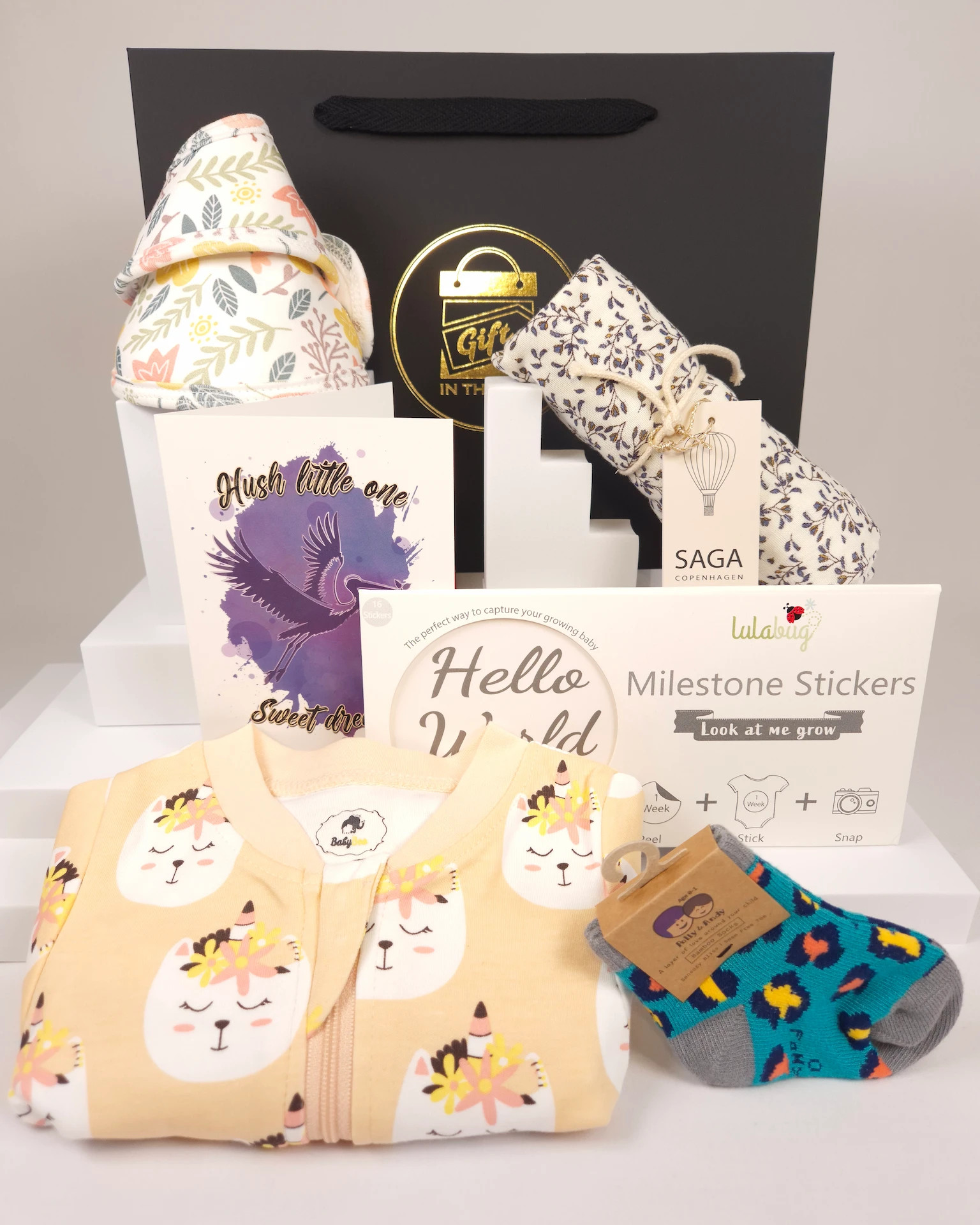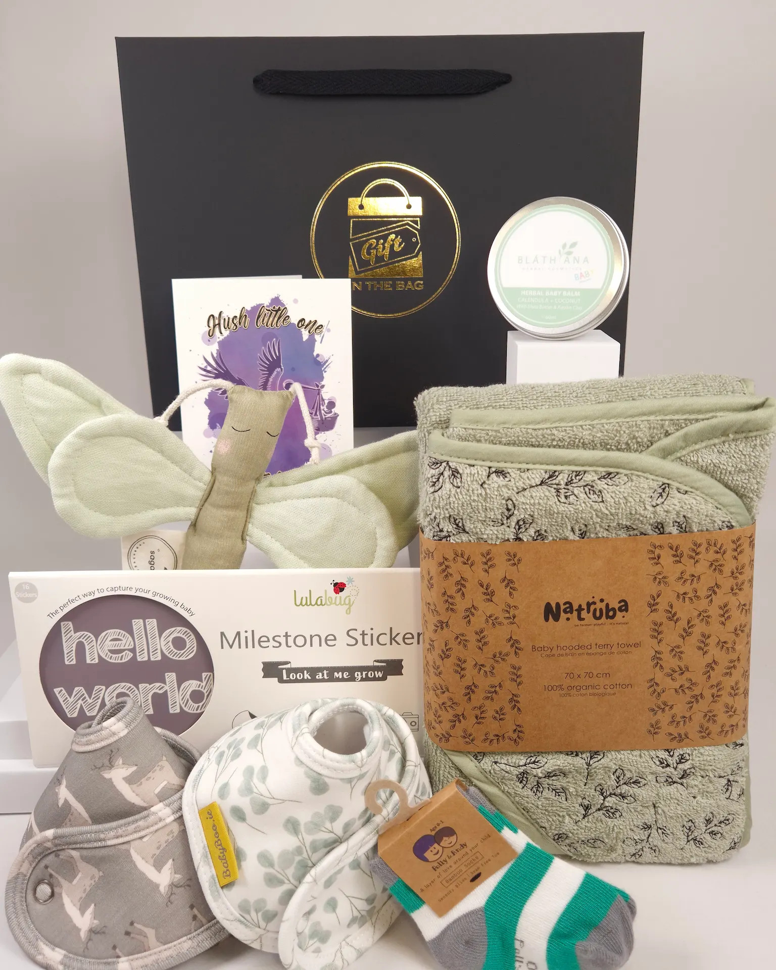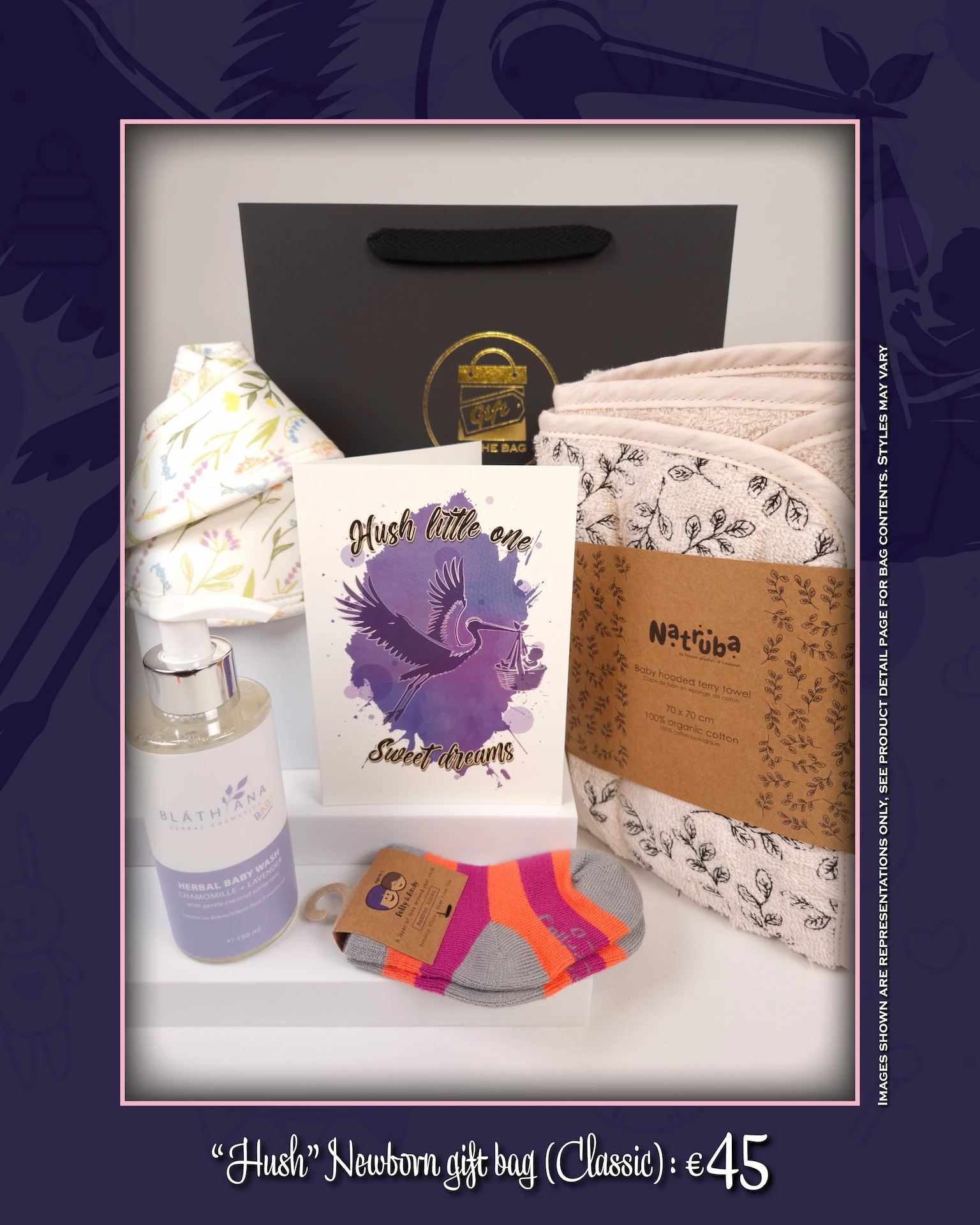 Introducing our "Hush" Newborn baby gift bag. Packed with soft textures, soothing scents and a variety of styles to match any preference; this is the perfect gift for any beautiful baby.